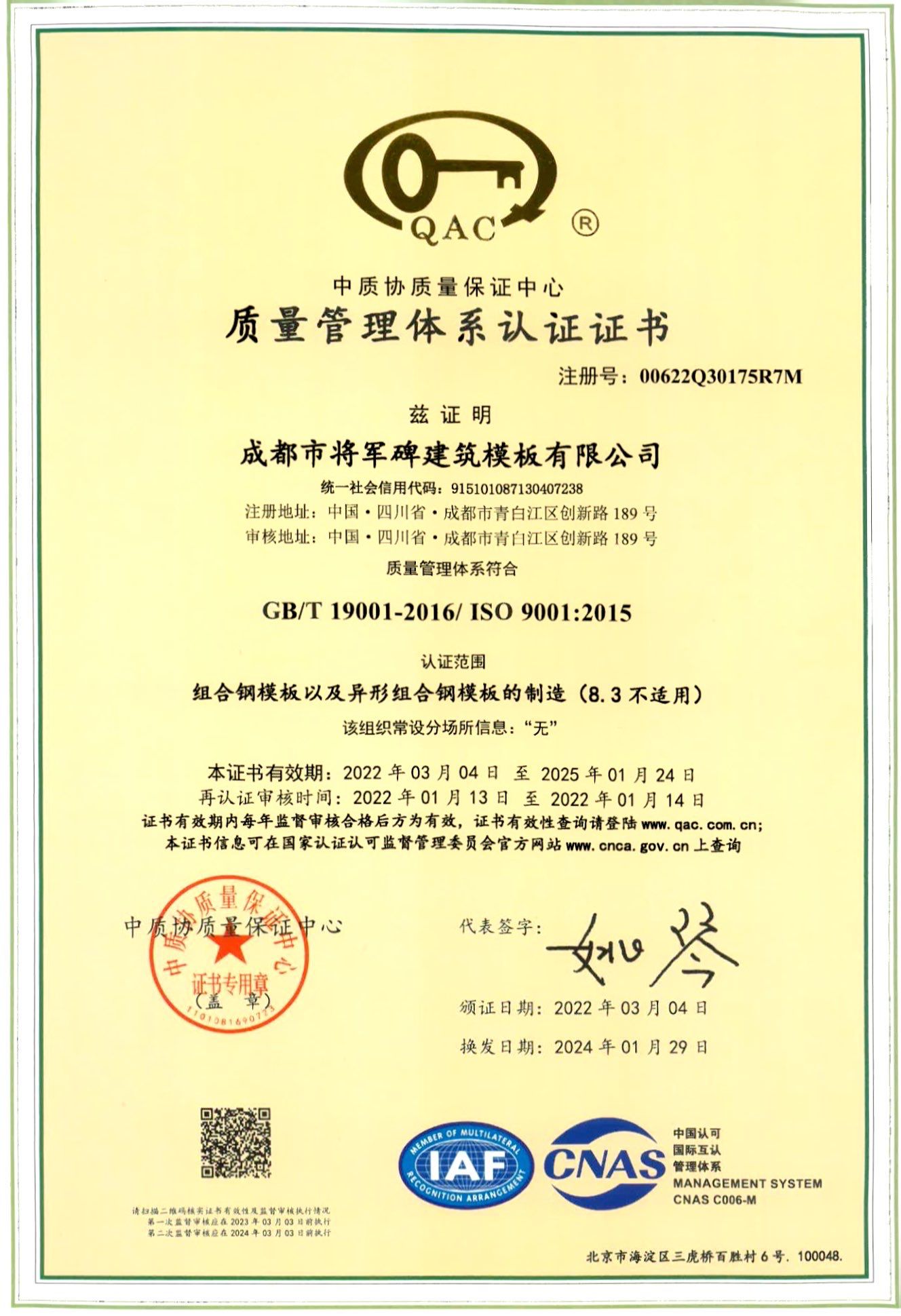 质量管理体系认证书